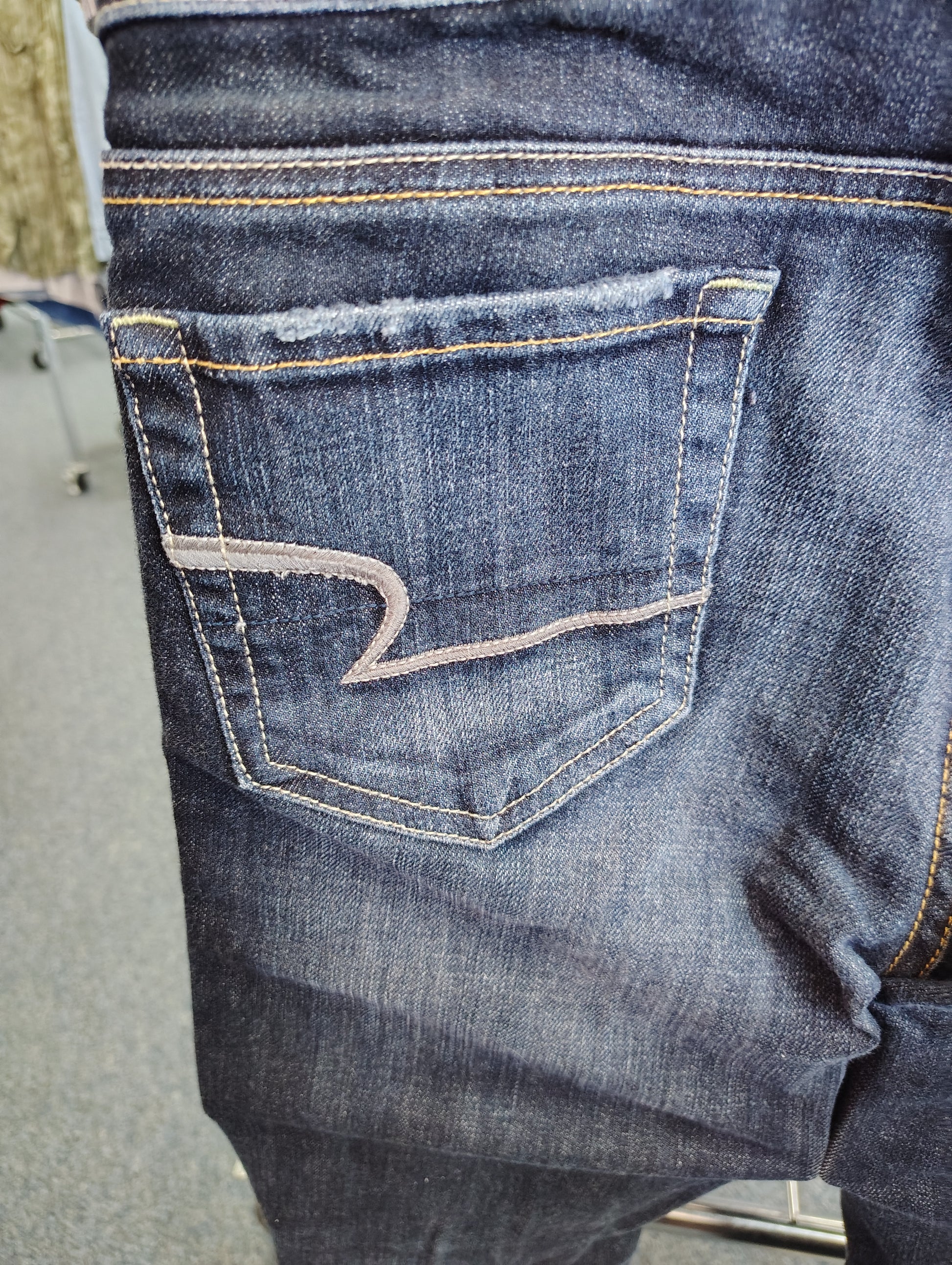 Low rise, distressed wash. 18.5-20.5" across the waist, 9" rise, 30" inseam, 10.5" leg opening.