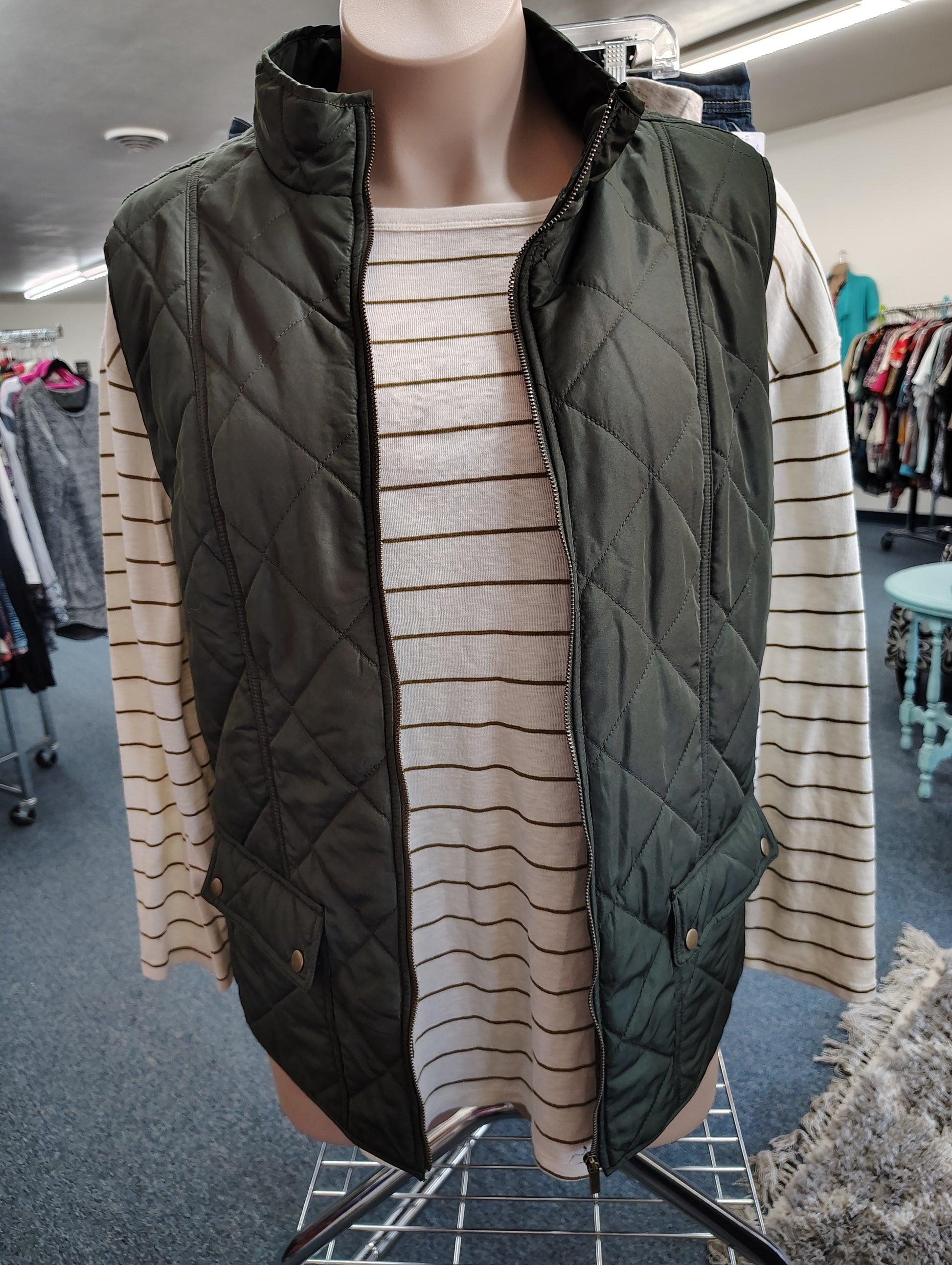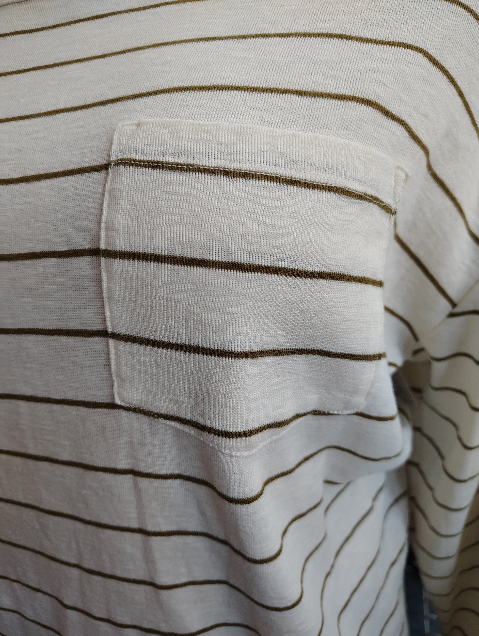 Has a front breast pocket, thicker material, stripes are like a green-brown color.