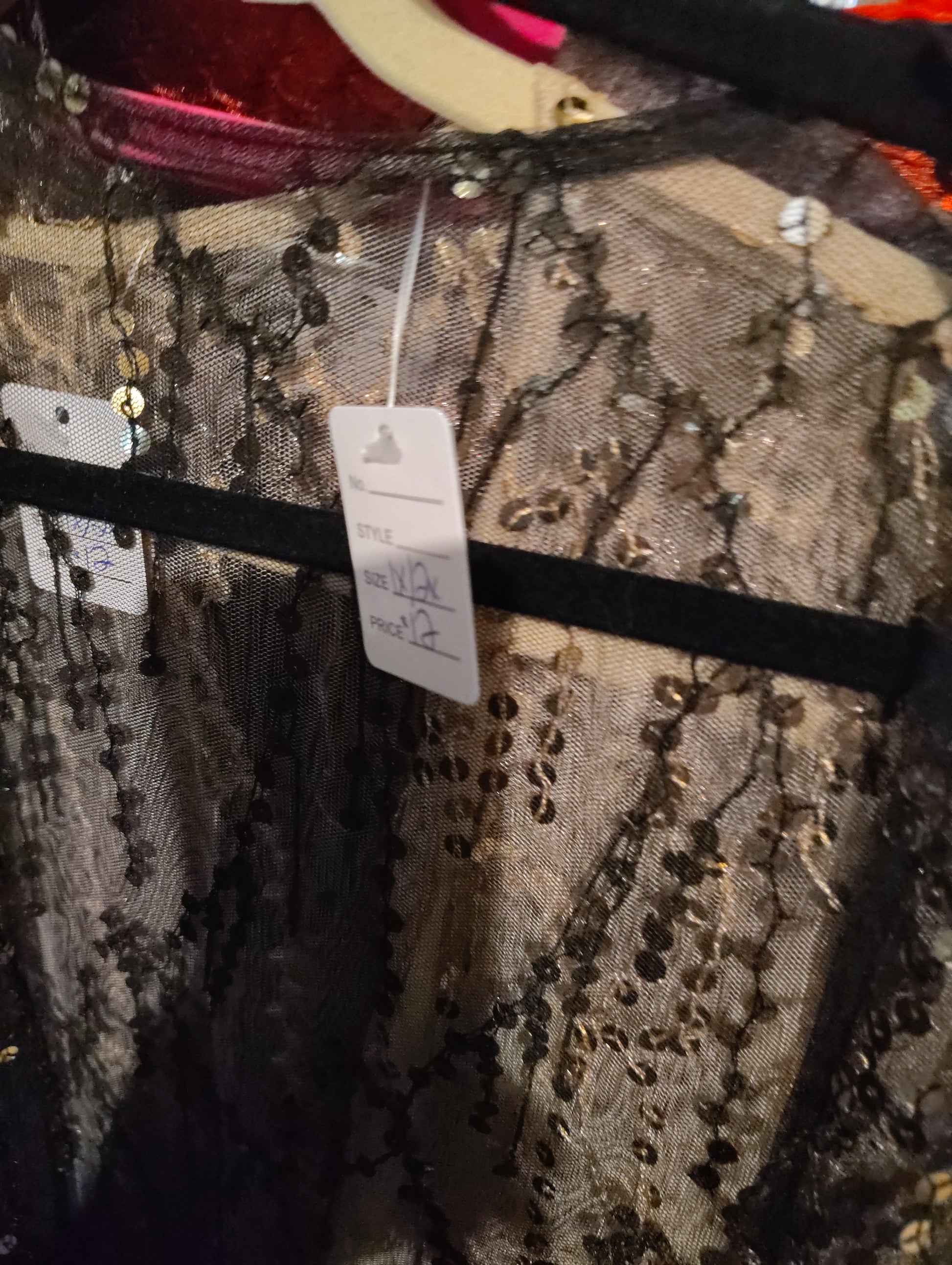 No brand, would best fit a 1x to smaller 2x. Black mesh look with silver sequins on strings. No stretch, duster length. This is so cute in person!