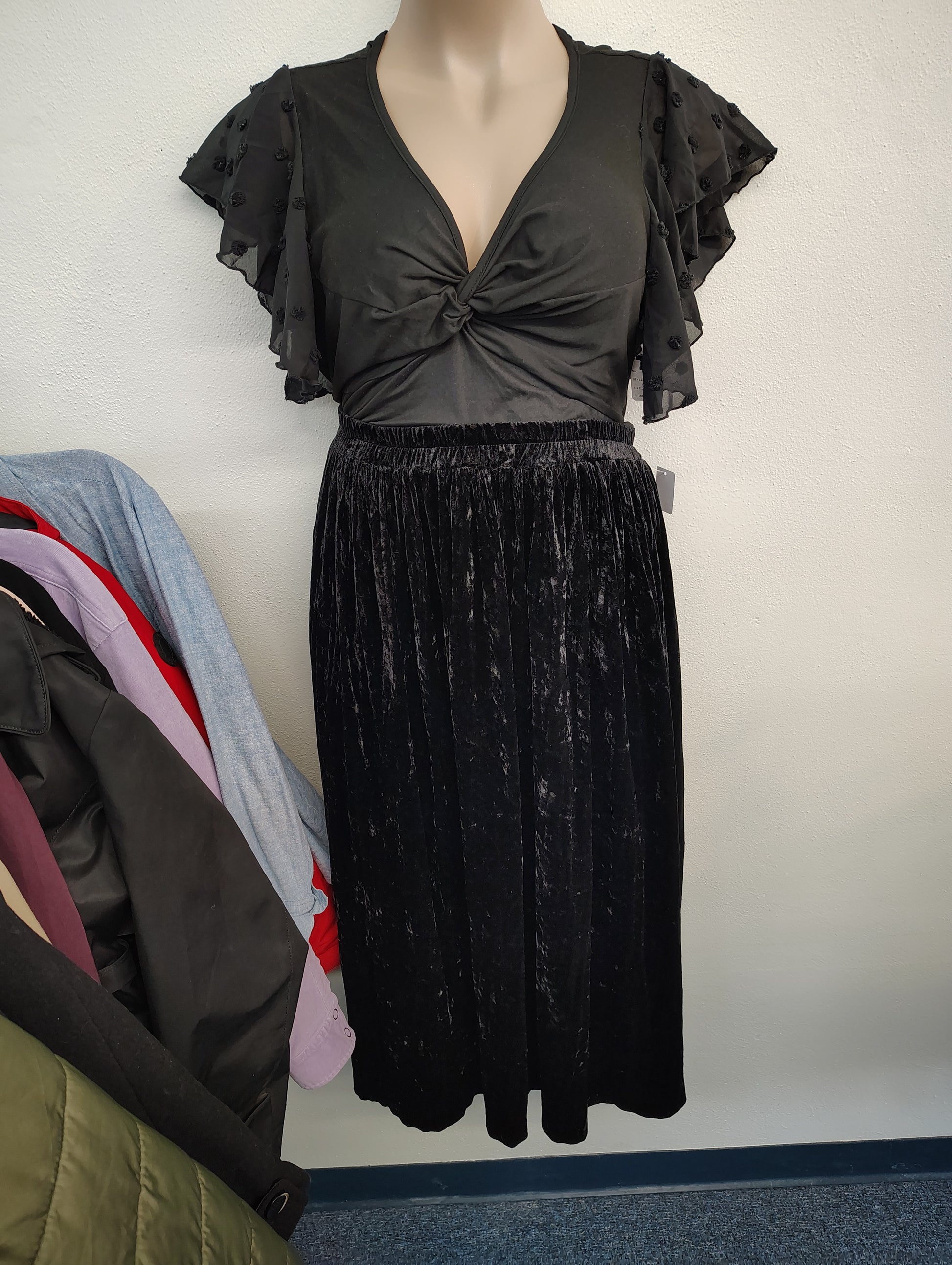 Stretchy, v-neck, patterned flutter sleeves. No brand.