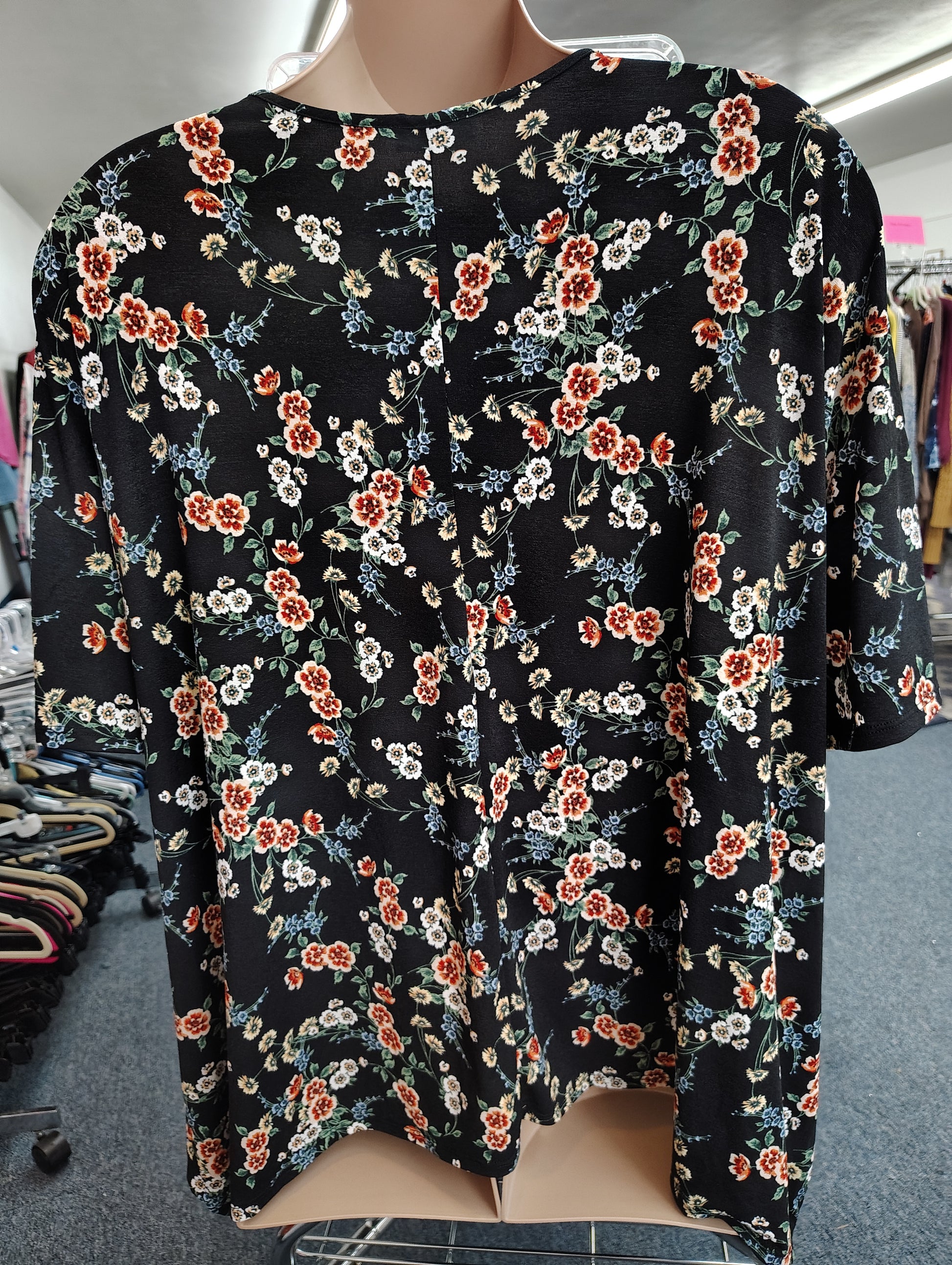 Longer on the sides, knit and stretchy, loose fit. Could easily fit a 2x.