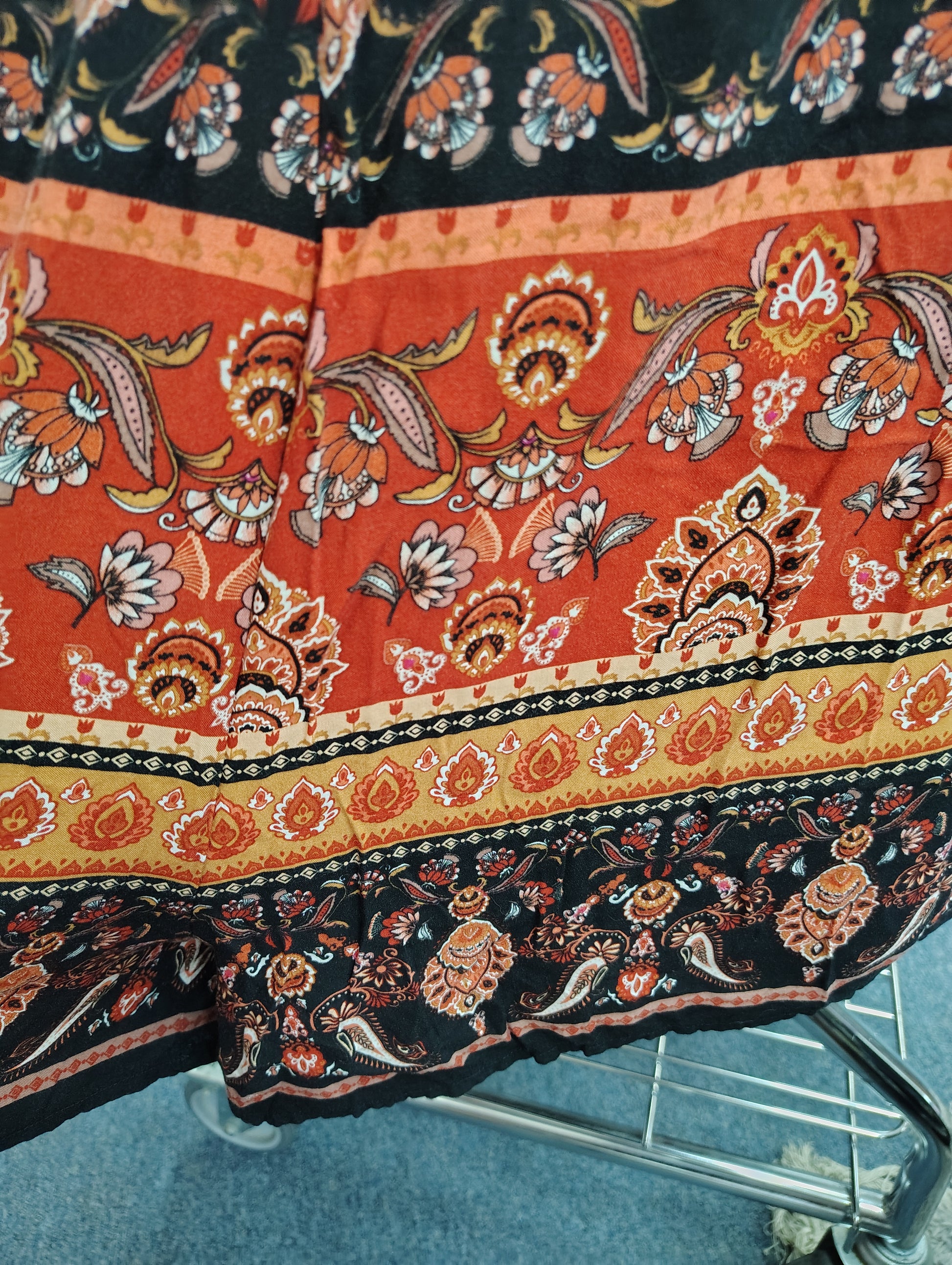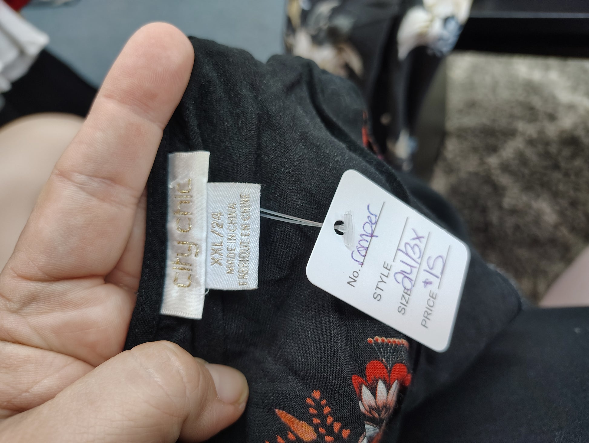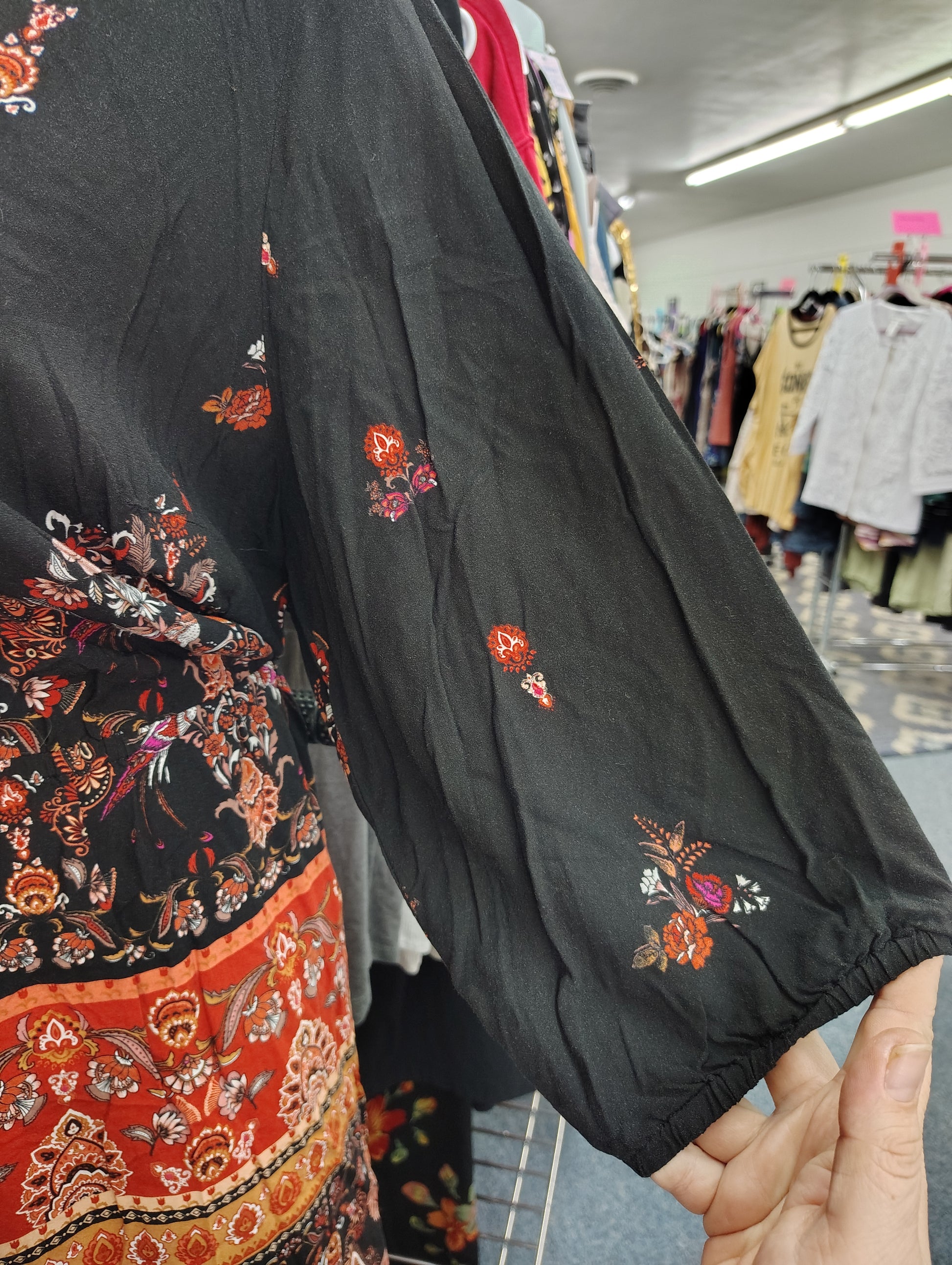 City Chic has odd sizing, this is labeled XXL/24. Would best fit a 20/22 I think. The fabric is not stretchy. It is lightweight with floral and paisley print. Buttons on the front, long sleeves. Very cute for nicer fall days.