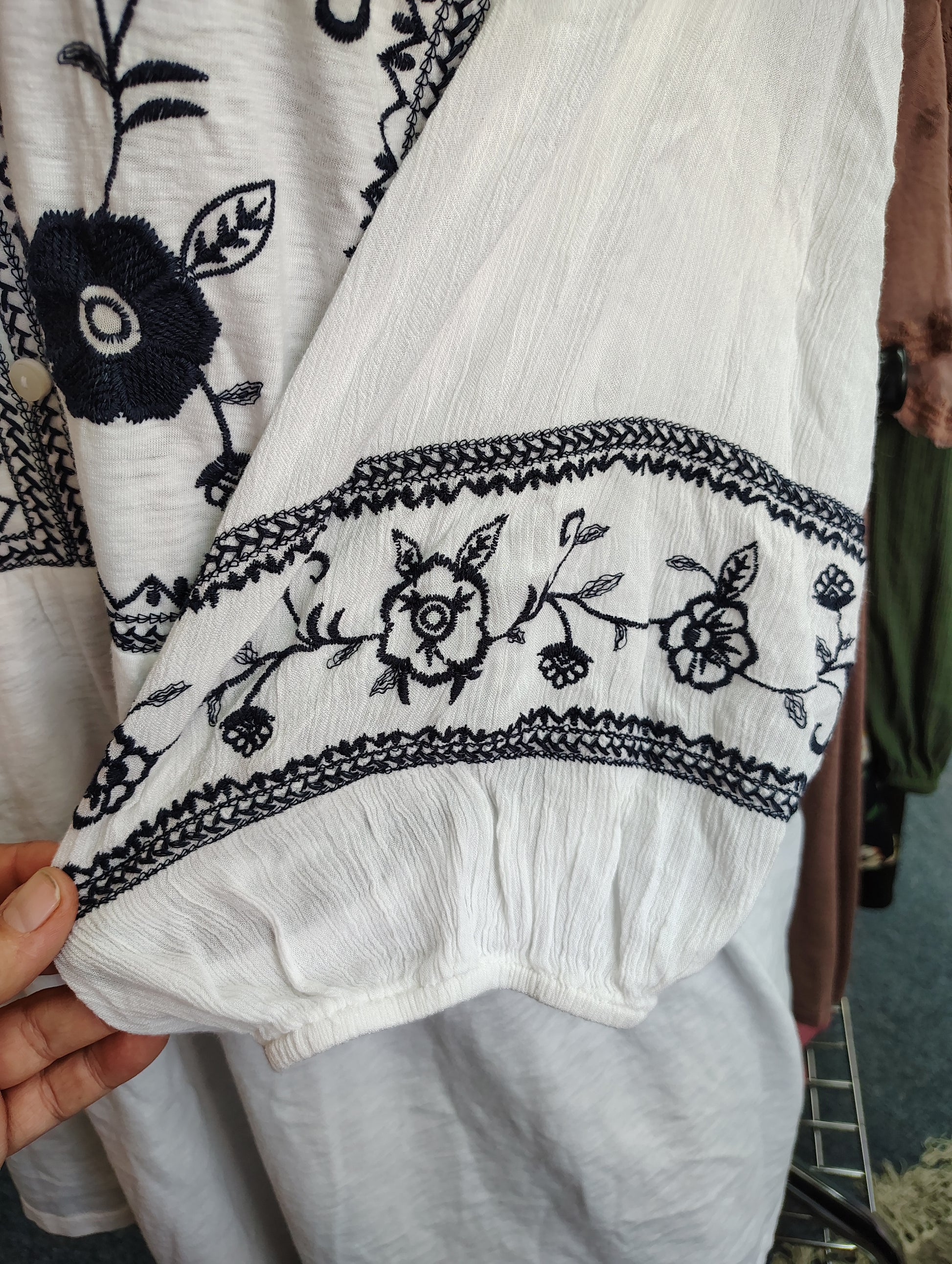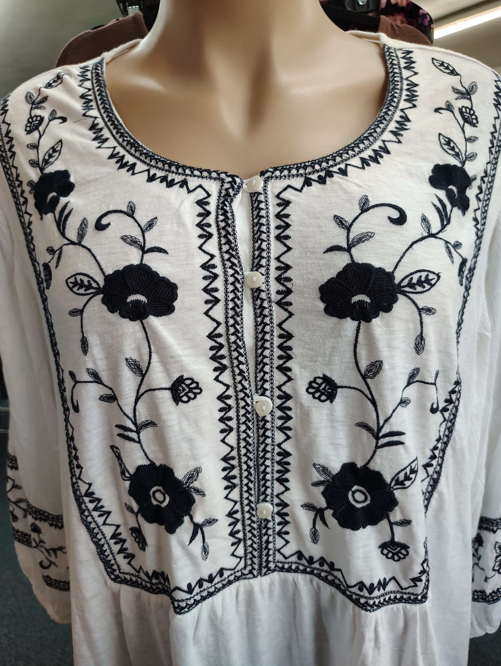 Buttons on the neckline, embroidery on the top and the sleeves