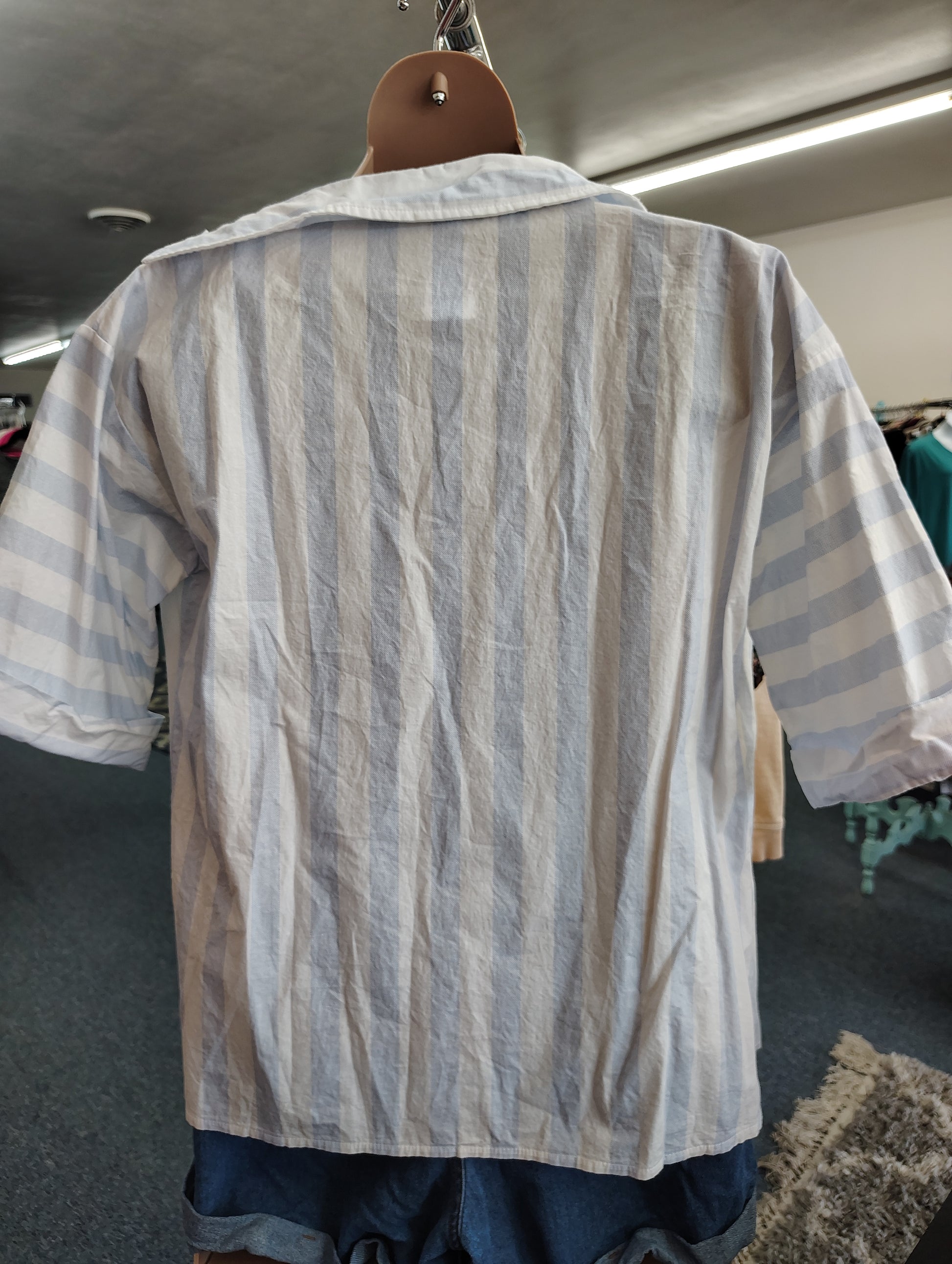 Cuffed short sleeves, no stretch, 1 front pocket. No size label, fits like an XL or 1x.
