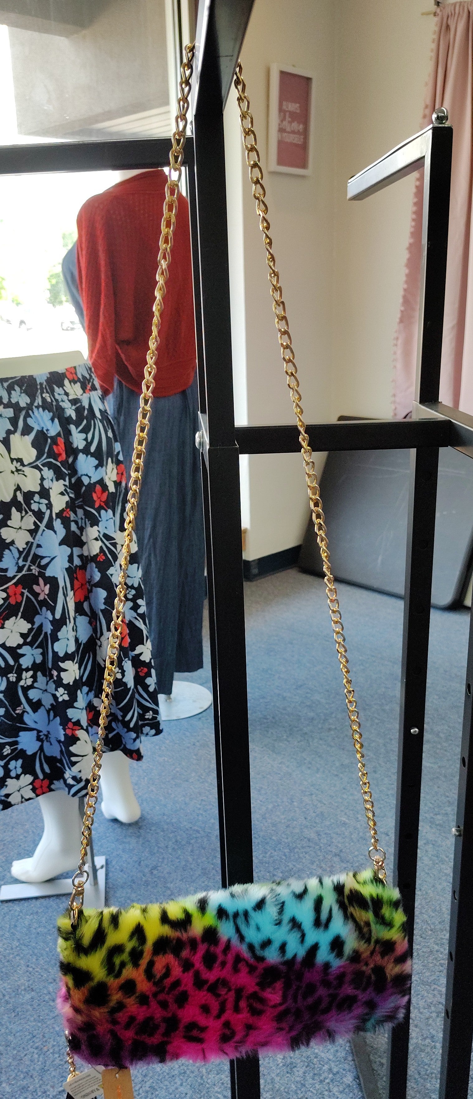 Fold over clutch purse in fuzzy rainbow style. Has a large zip pocket and smaller zip pocket. Detachable gold chain crossbody strap. Super cute.