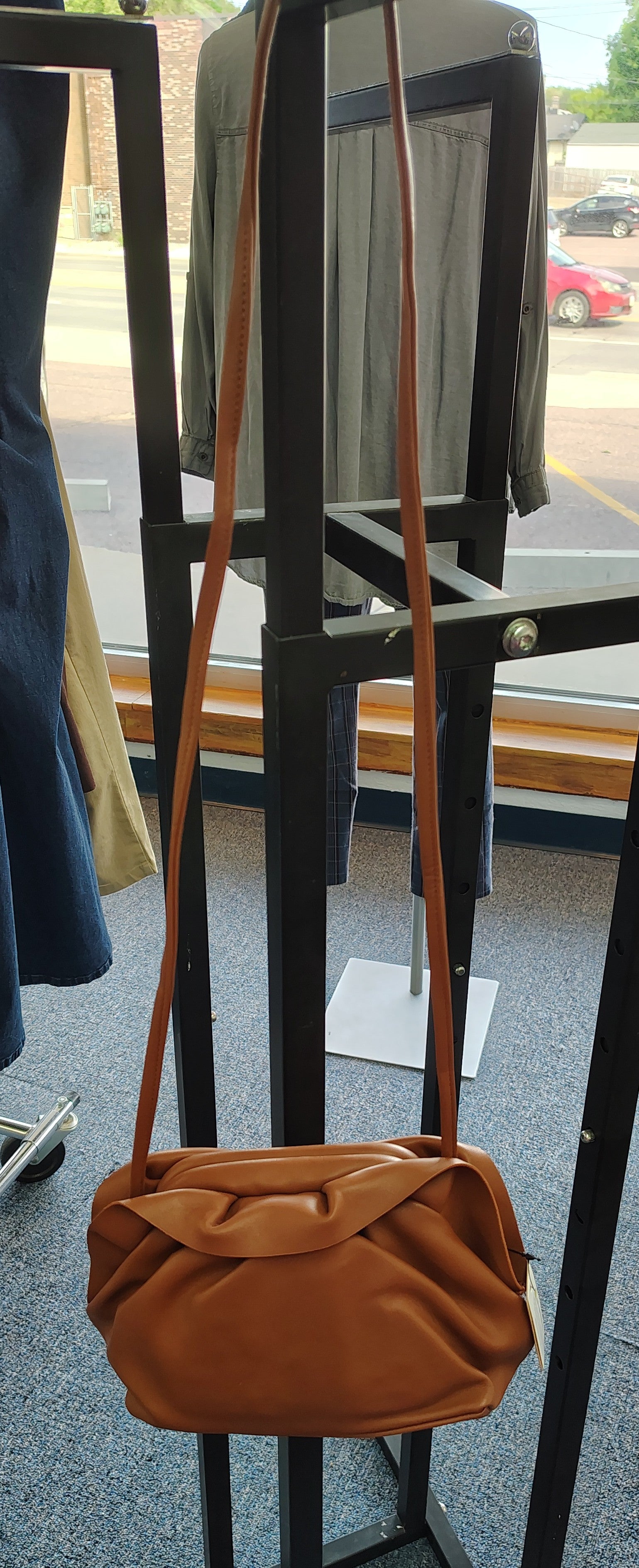 It is a smaller size, but still has a good amount of room inside. One zipper pocket inside. Faux leather.