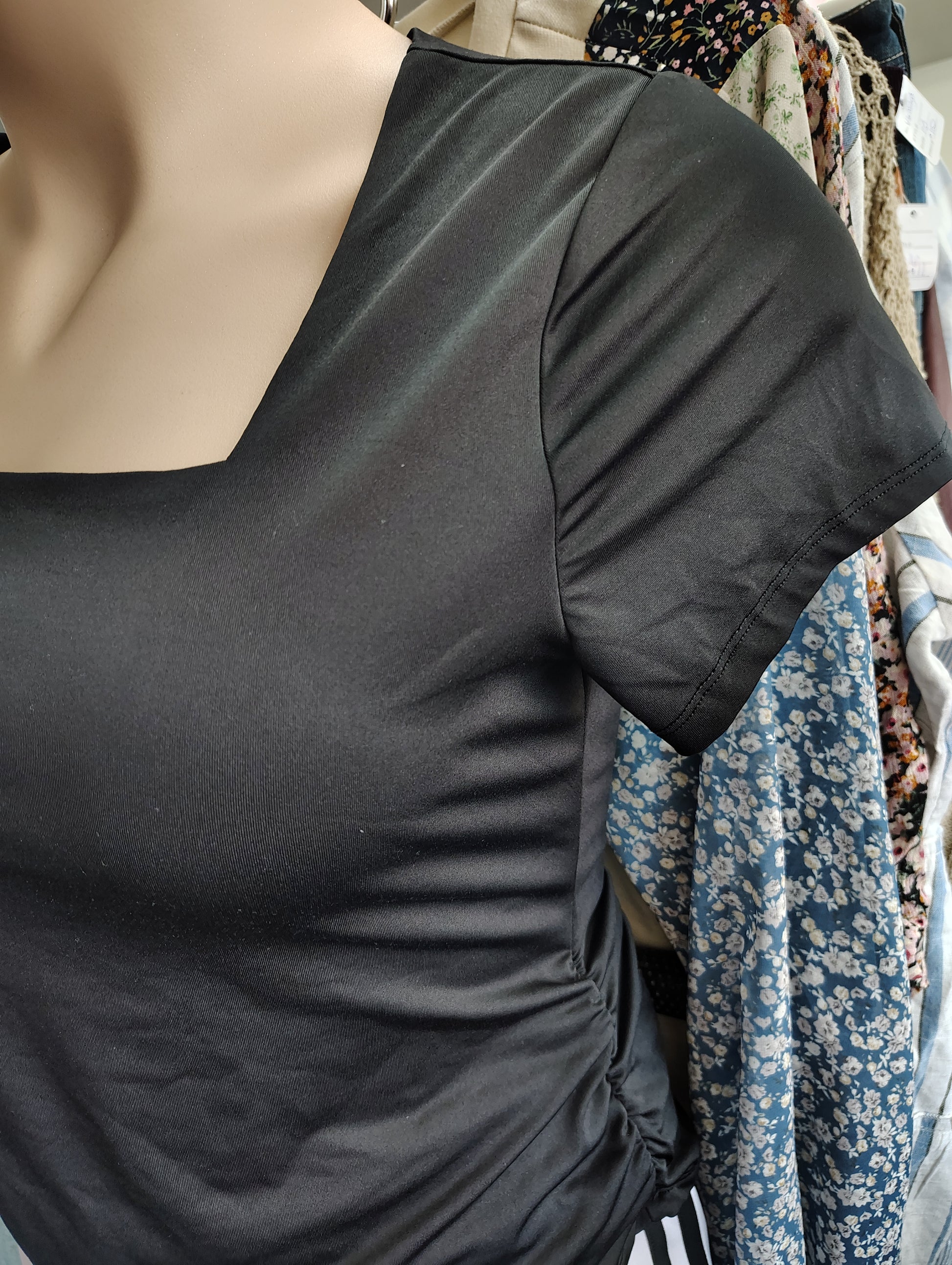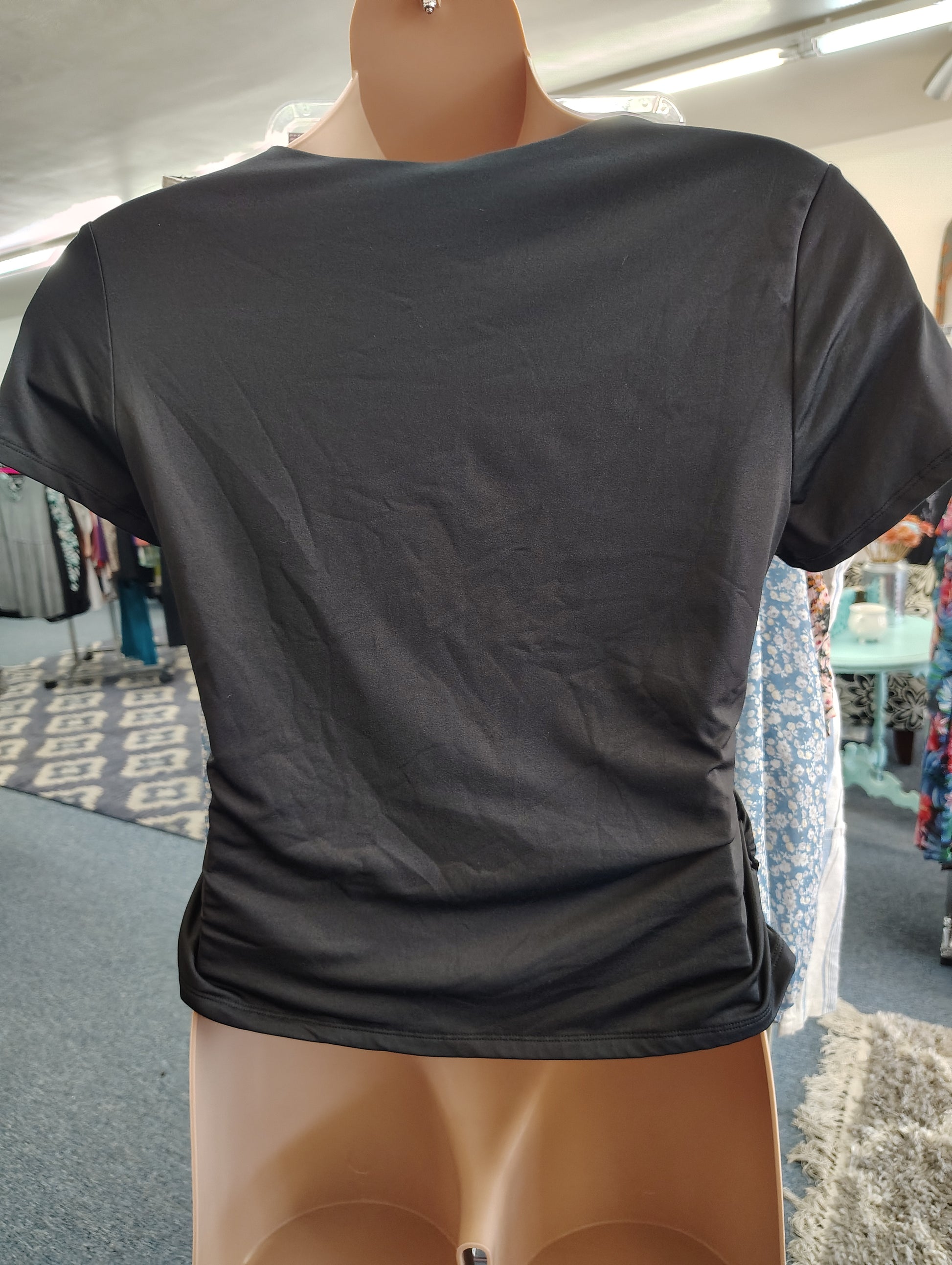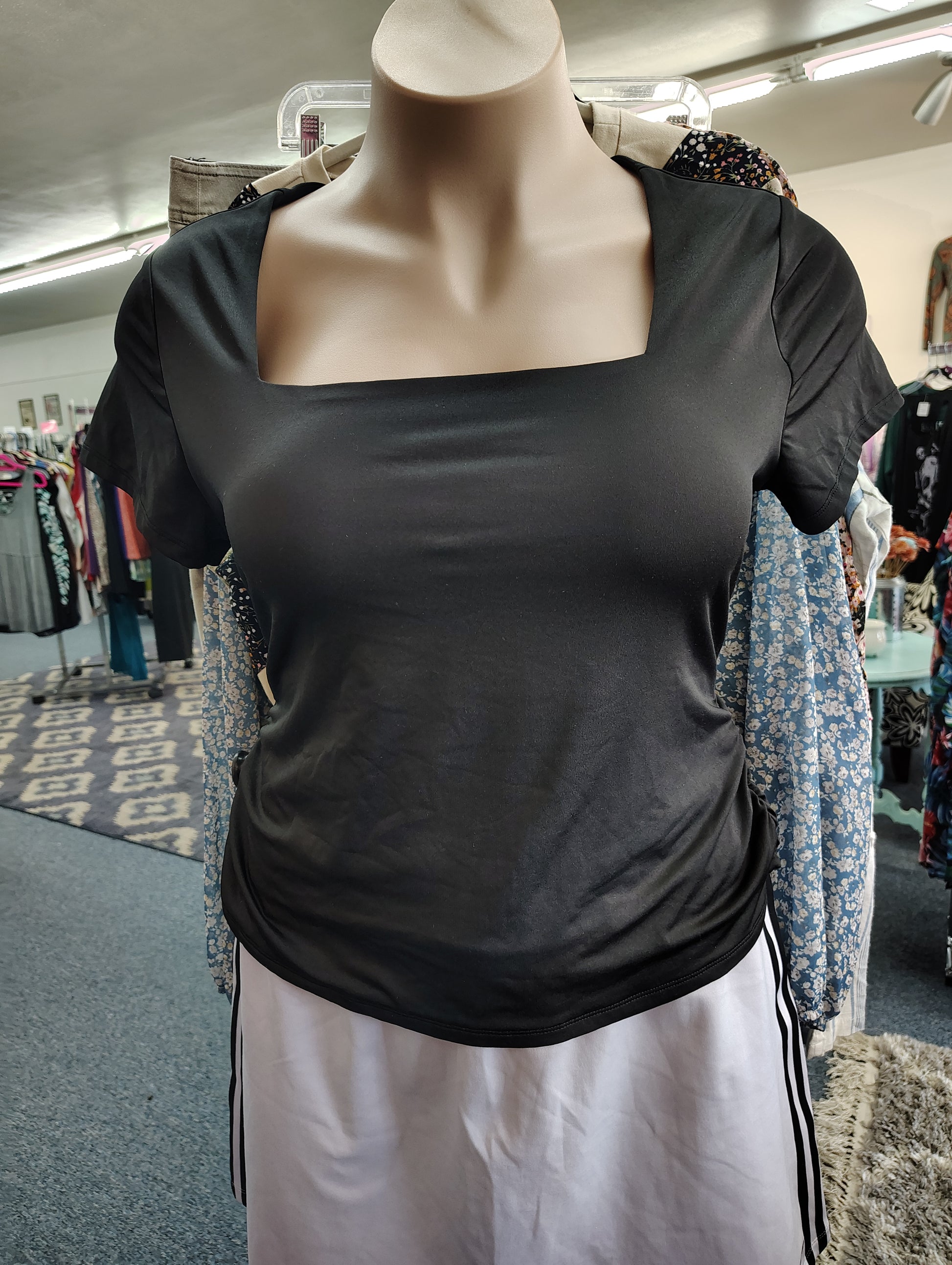 Labeled XXXL junior's size, would best fit a 1x to smaller 2x. Black thicker material with ruched sides.