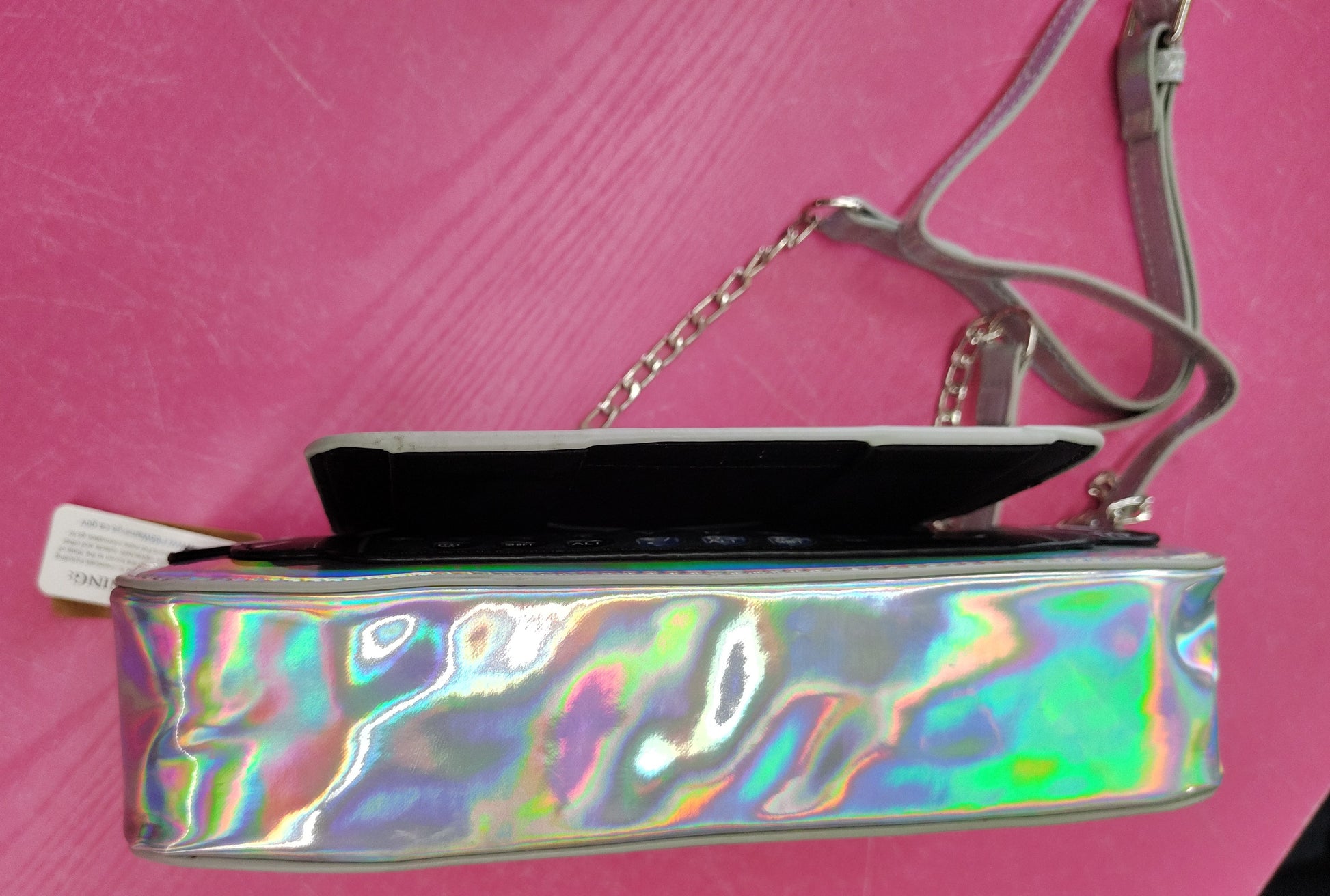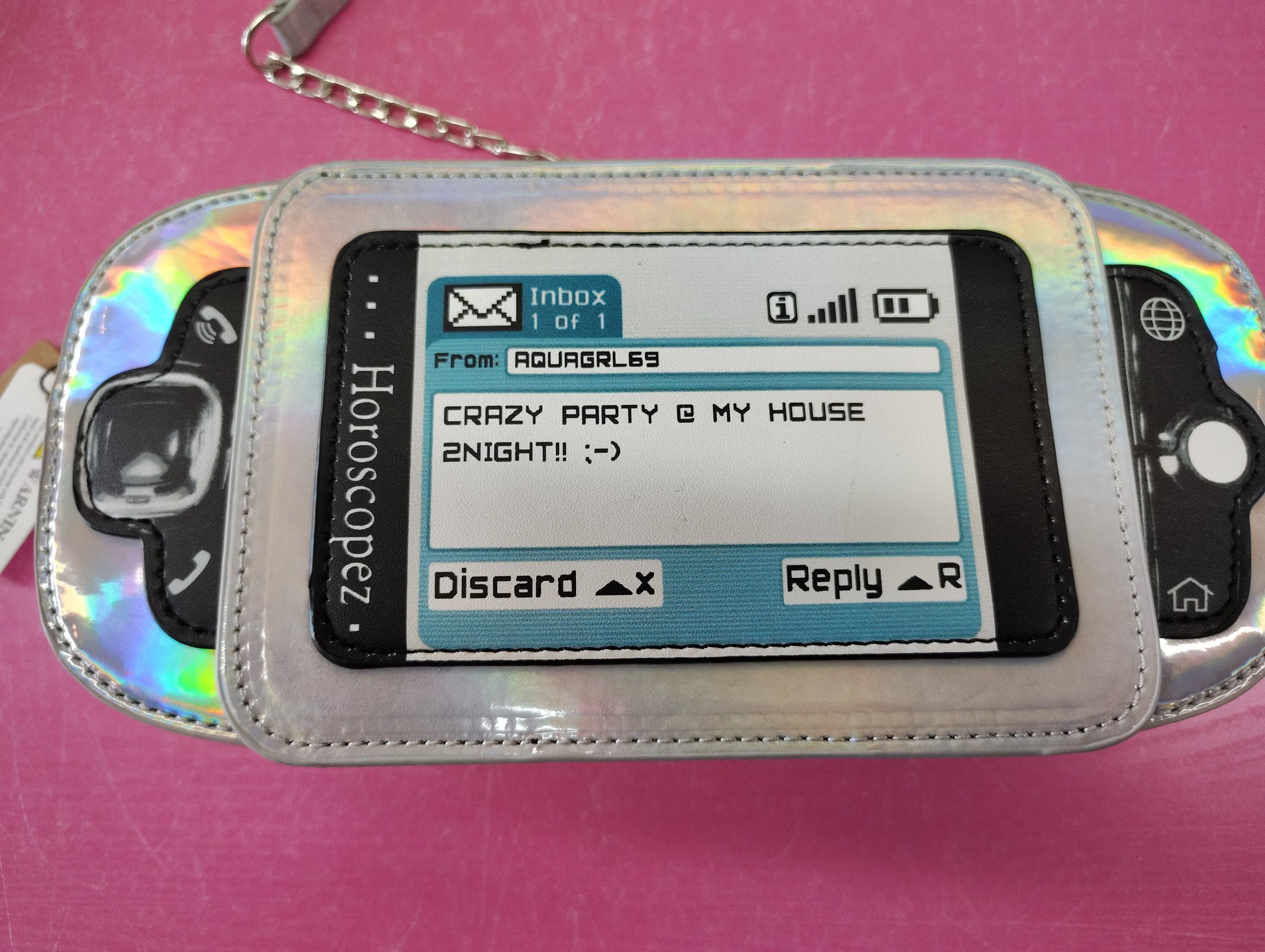 Flip front phone look that opens to alphabet. Zip top with pocket inside. Good size and so fun! Shiny metallic silver. Detachable strap.