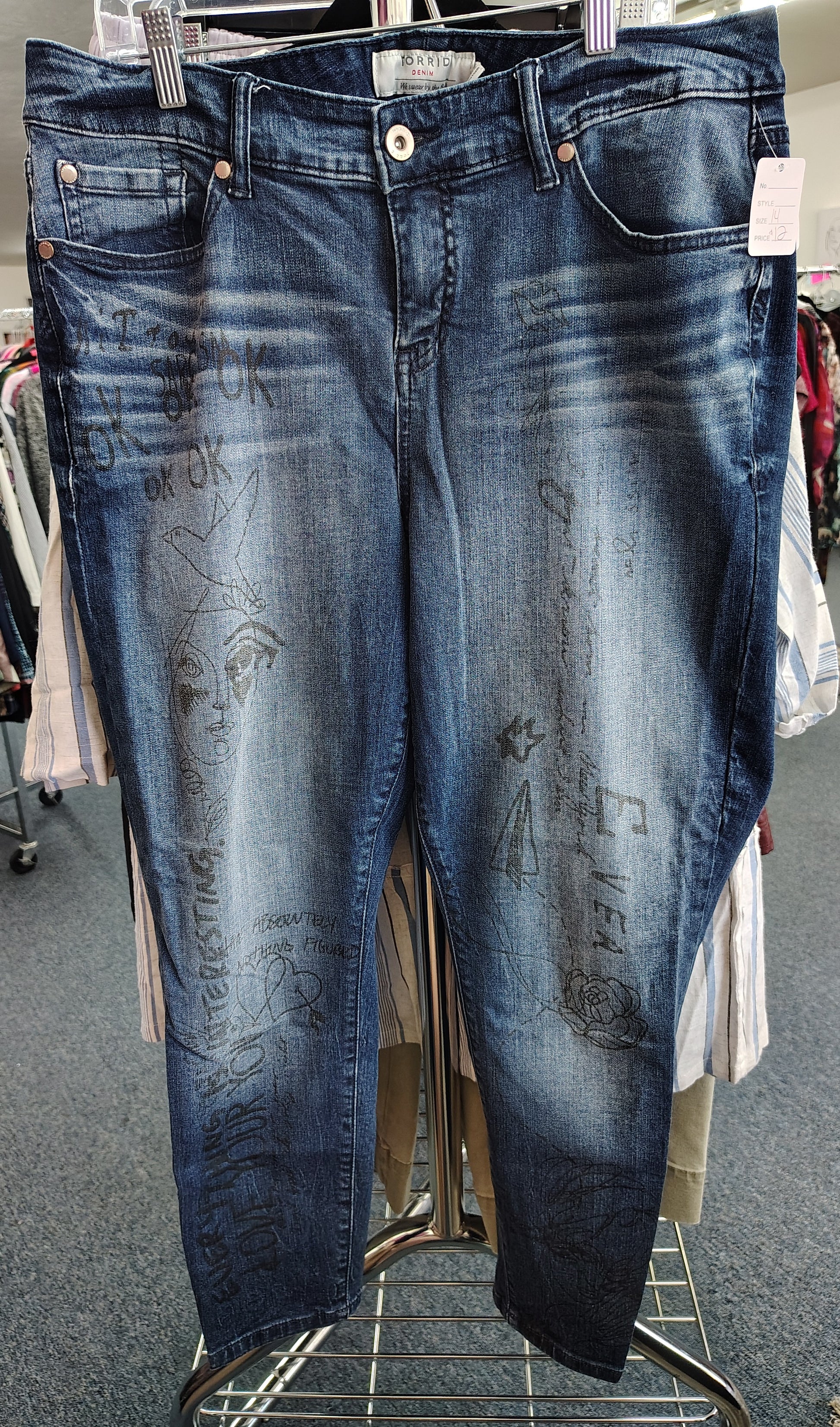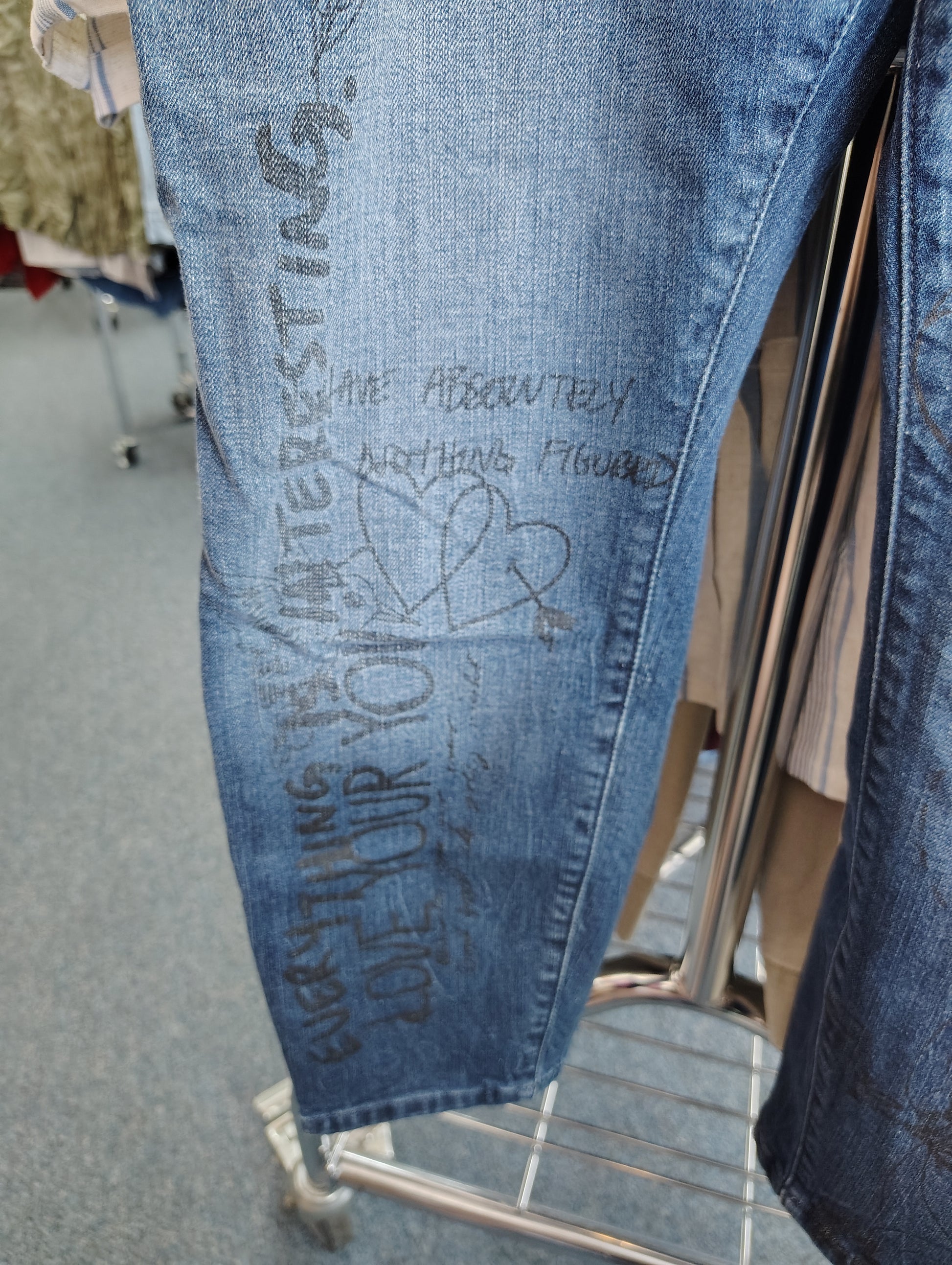 There is a design of drawings on the legs. 18.5-20.5" across the waist, 11" rise, 27" inseam, 6" leg opening