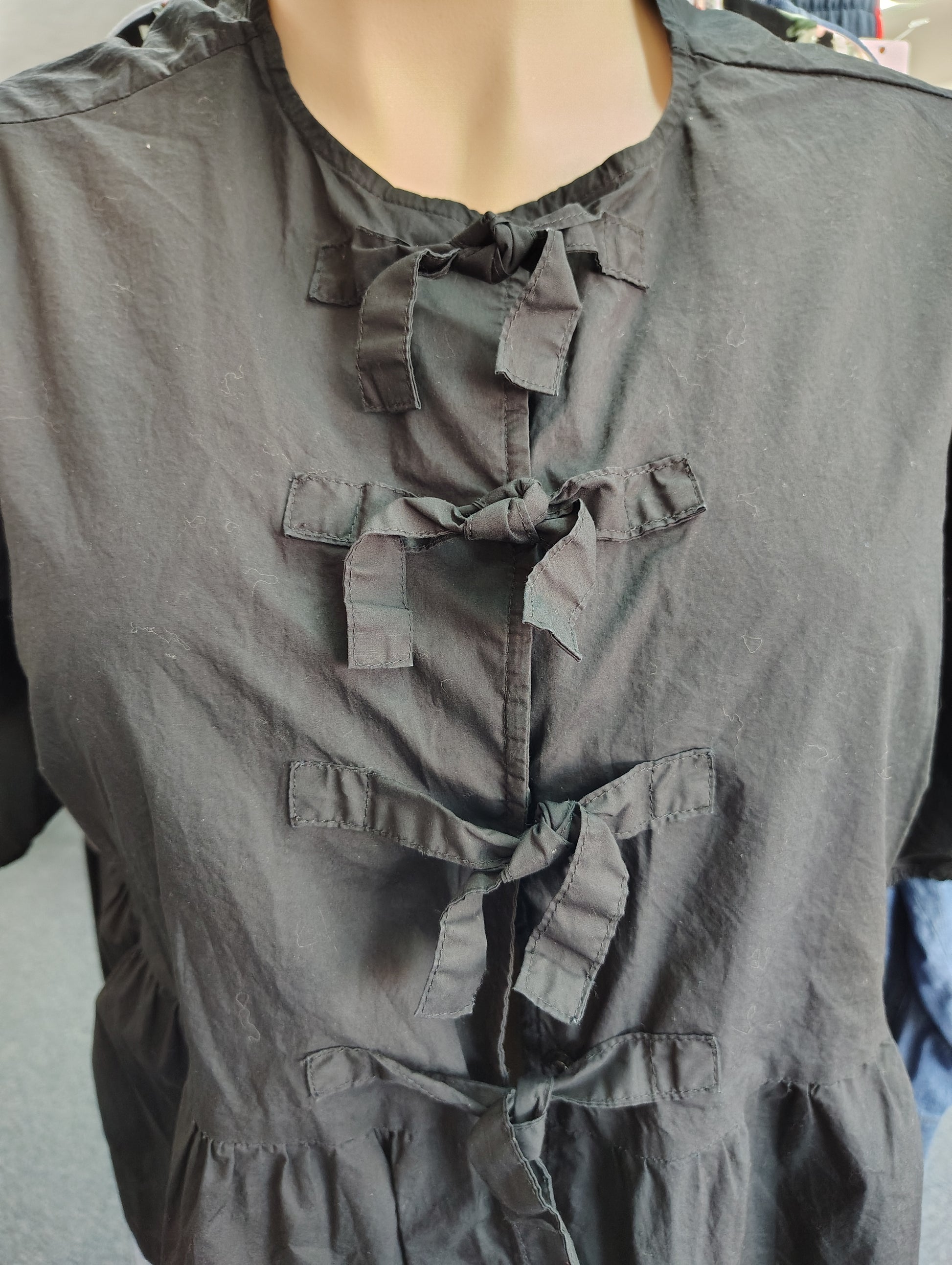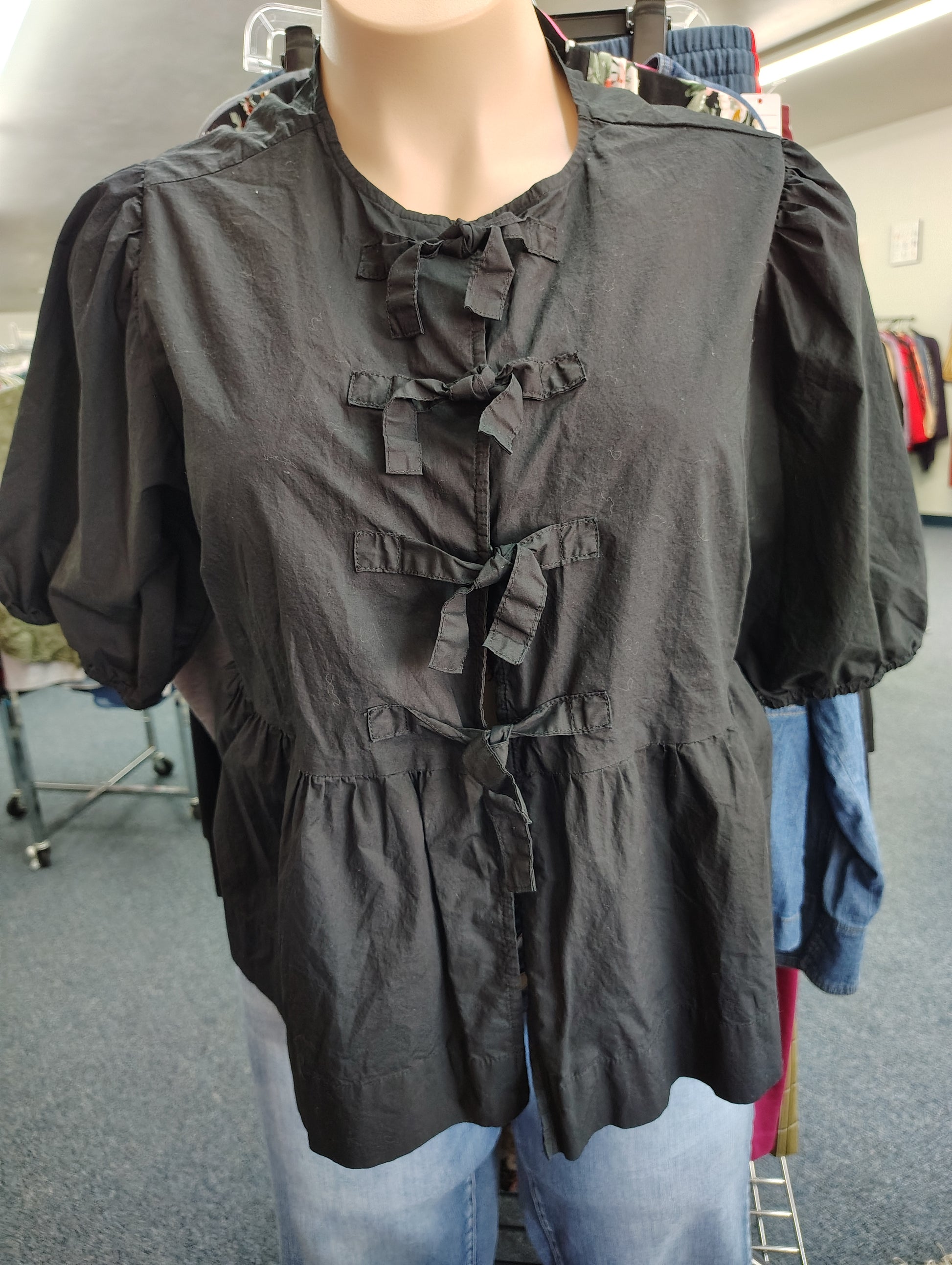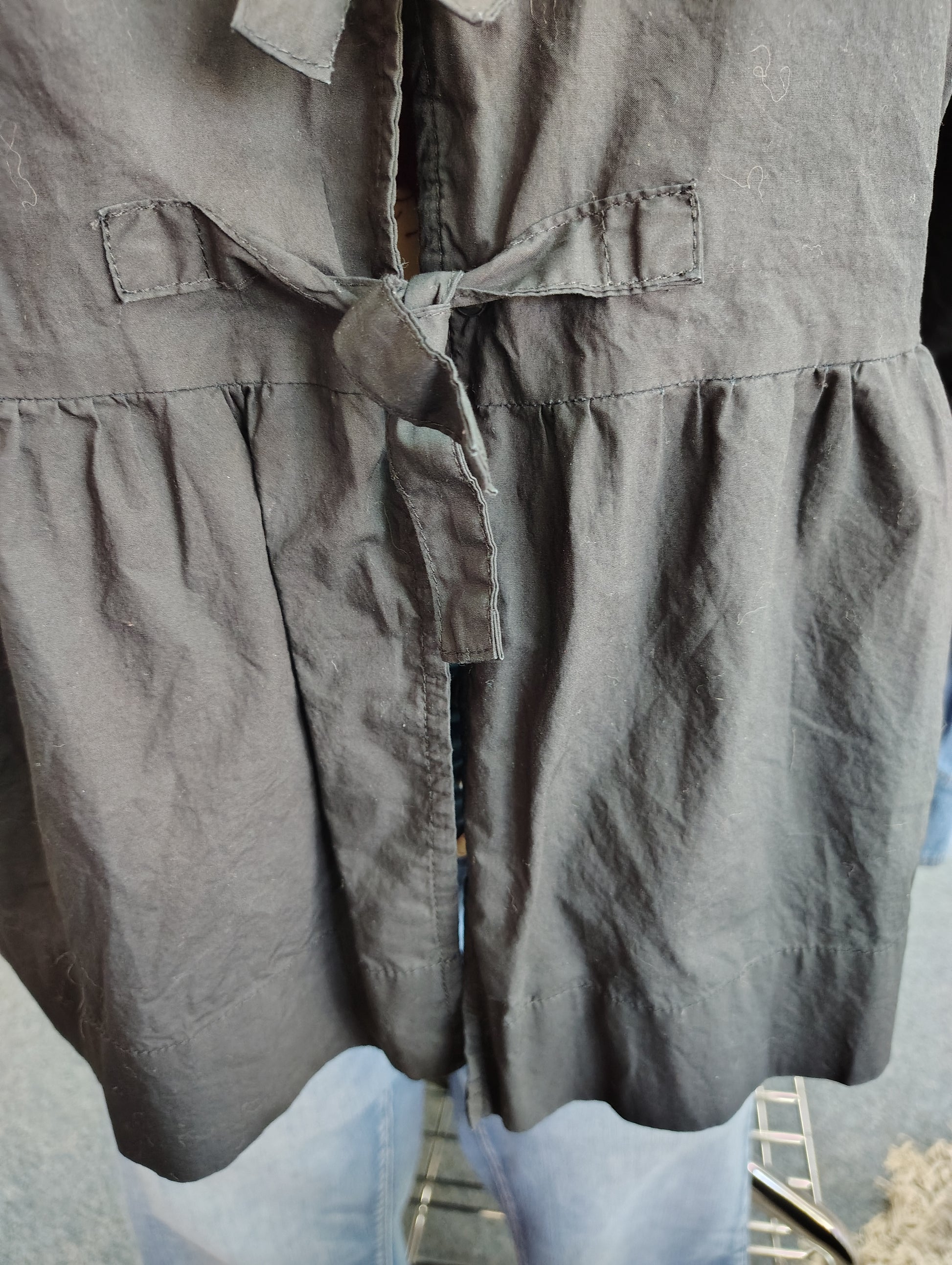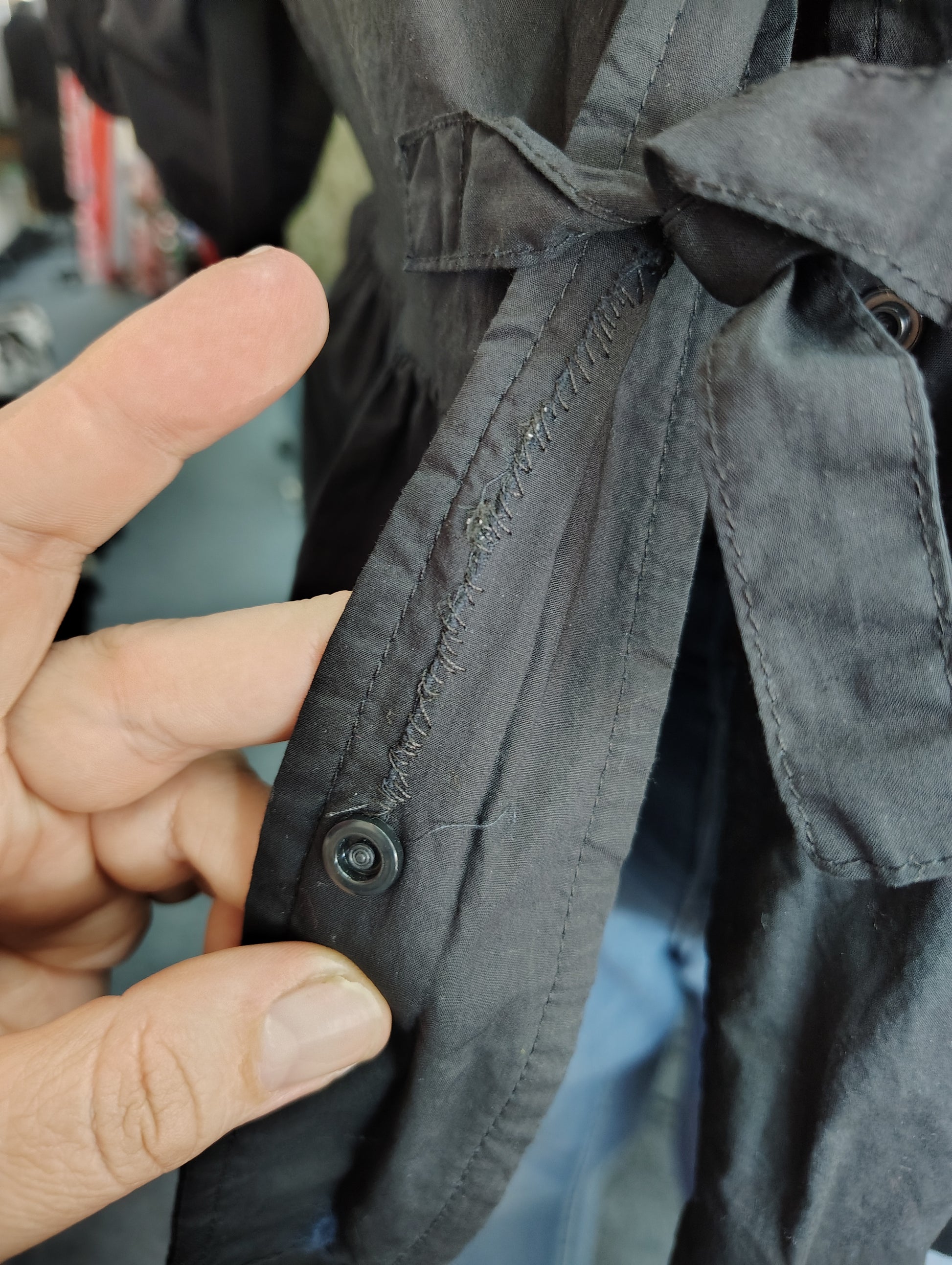 Has buttons on the inside, the bottom one someone altered to move one side down but not the other. I have no idea why. It runs oversize.