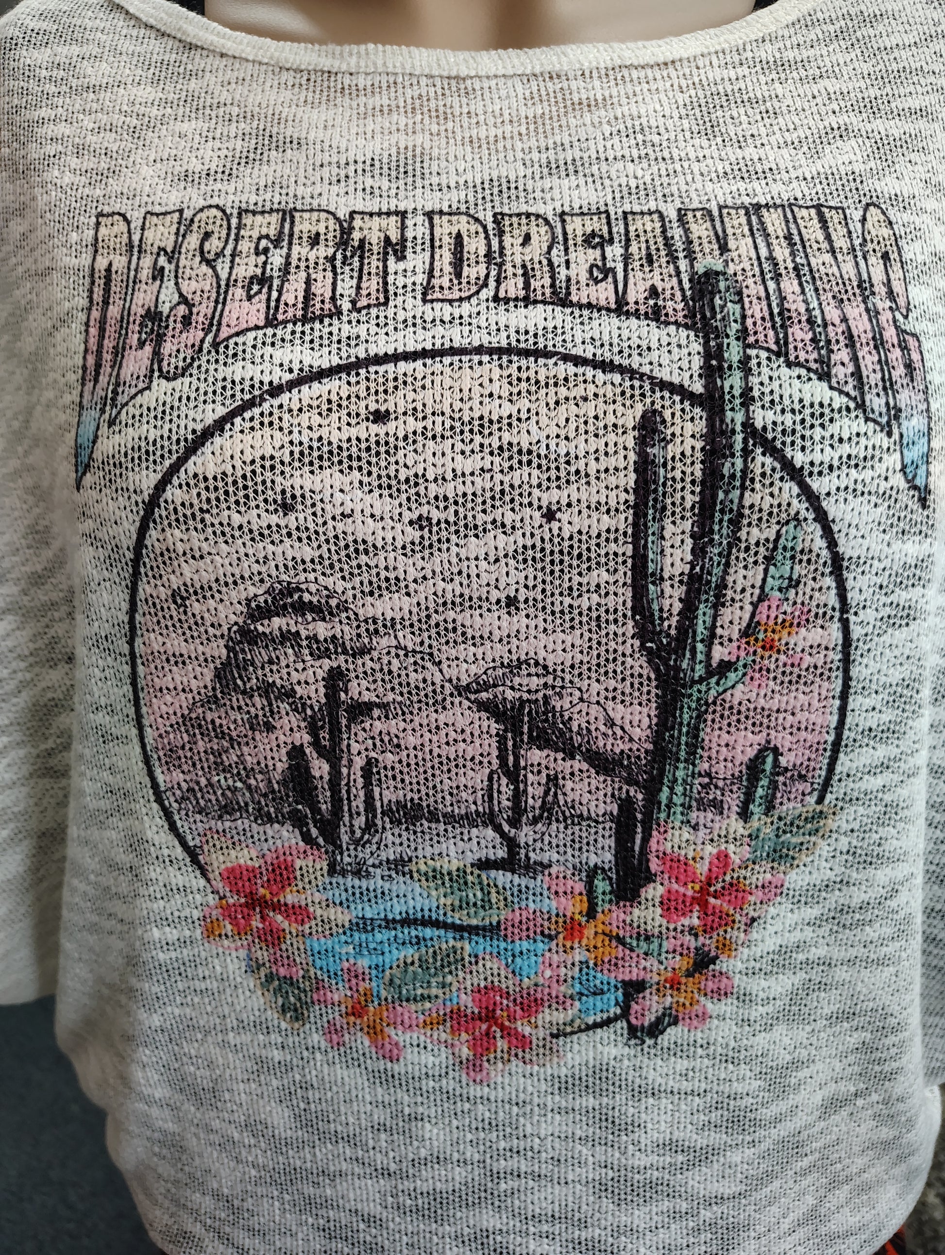 White, semi sheer, dolman short sleeves. More fitted at the bottom. Desert print design.